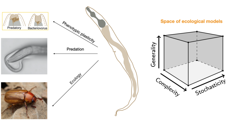 In order to understand this process, we observe the succession of nematodes on beetles sampled from our field station on La Réunion island. Subsequently, we measure traits of interest, including mouth-form plasticity, in the lab for nematodes emerging in these communities. A crucial aspect in these measurements is the preservation of variation in the data, achieved by employing Bayesian models, in order to better understand the role of intraspecific variation. The laboratory measurements are combined with sophisticated agent-based models to illustrate the potential ecological dynamics that could unfold in such communities.
